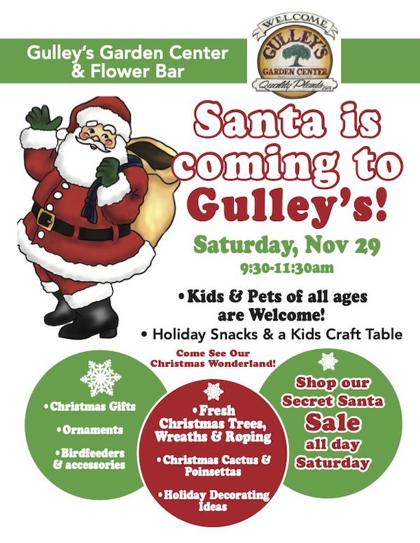 Santa is coming to Gulley’s Garden Center! Children of all ages and pets are welcome. You can also shop their "Secret Santa Sale", enjoy holiday treats, and take the kids to the craft table.